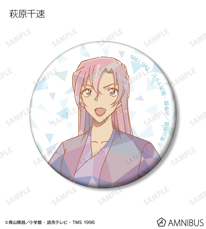 江戸川コナン、灰原哀、毛利蘭、世良真純、萩原千速、横溝重悟、松田陣平、萩原研二のイラストにプリズムを散りばめた模様を組み合わせ、缶バッジに仕上げました。