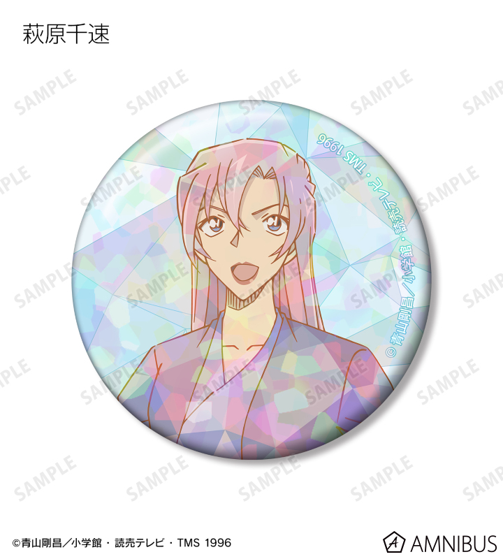 江戸川コナン、灰原哀、毛利蘭、世良真純、萩原千速、横溝重悟、松田陣平、萩原研二のイラストにプリズムを散りばめた模様を組み合わせ、ホログラム加工を施した缶バッジに仕上げました。