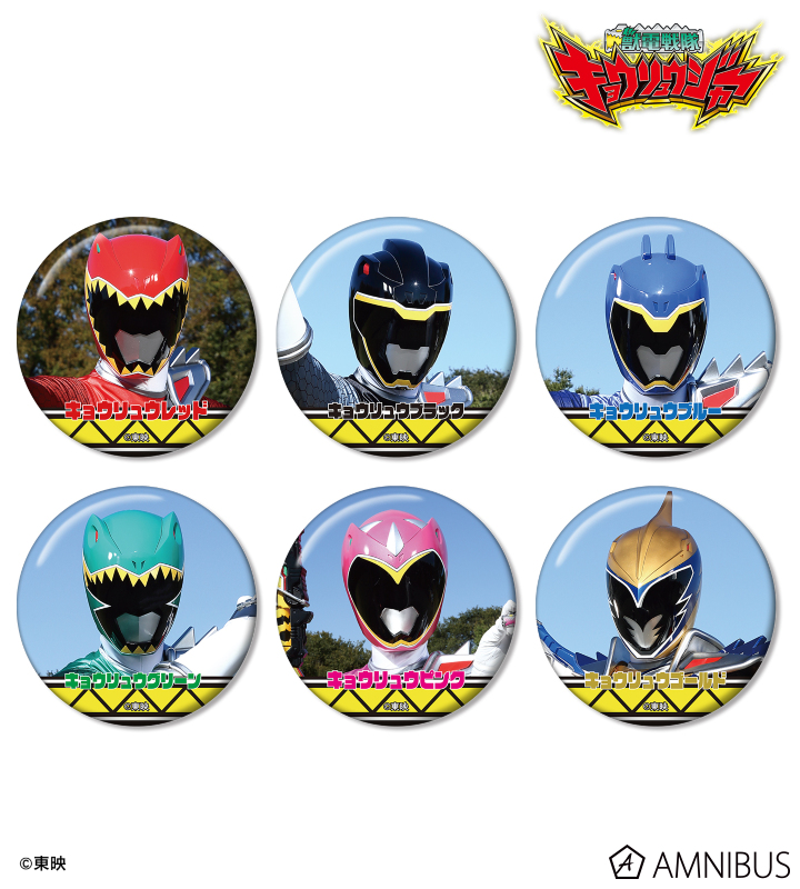 キョウリュウレッド、キョウリュウブラック、キョウリュウブルー、キョウリュウグリーン、キョウリュウピンク、キョウリュウゴールドを缶バッジに仕上げました。
