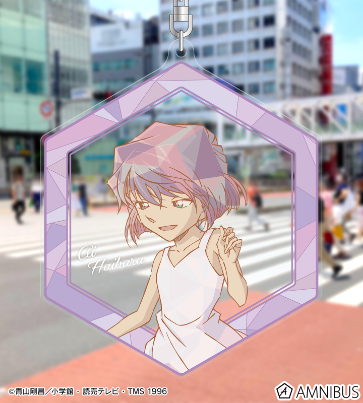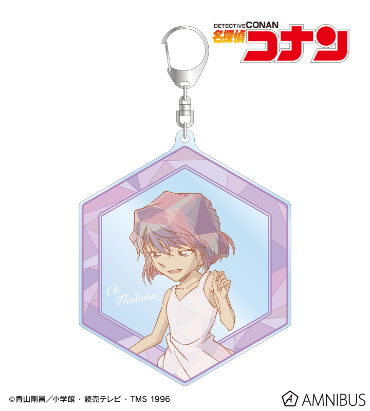 灰原哀のイラストにプリズムを散りばめた模様を組み合わせ、BIGなアクリルキーホルダーに仕上げました。