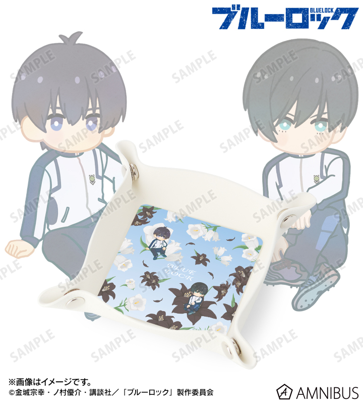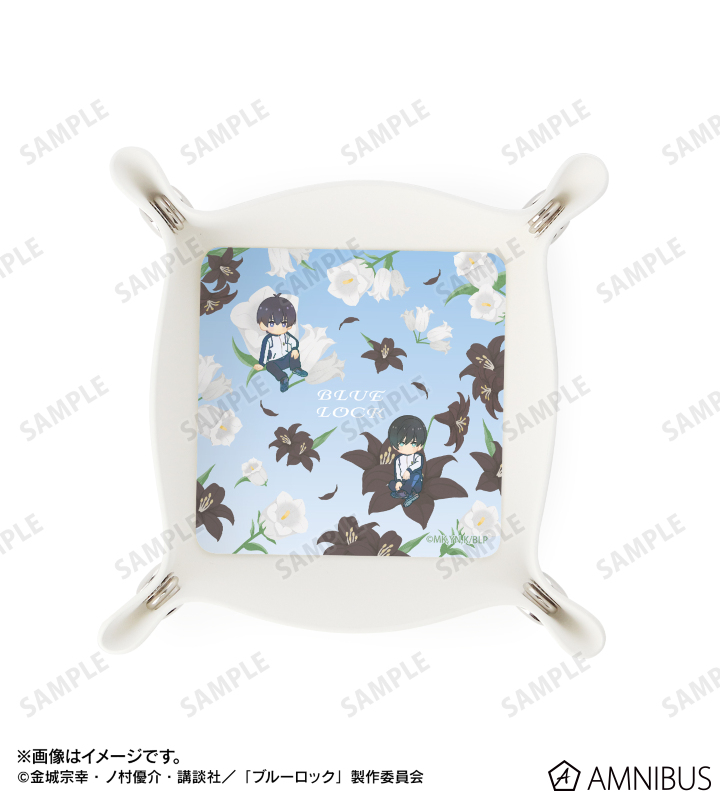 潔 世一、糸師 凛のイラスト、各キャラクターをイメージした花をボタニカルデザインに落とし込んで繊細なタッチで新たに描き起こし、PUレザーマルチトレーに仕上げました。