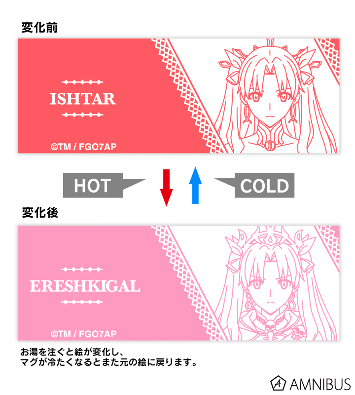 温度に反応する特殊なインクを使用しており、マグカップに温かい飲み物を入れると、イシュタルからエレシュキガルへ変化します。