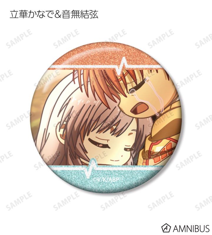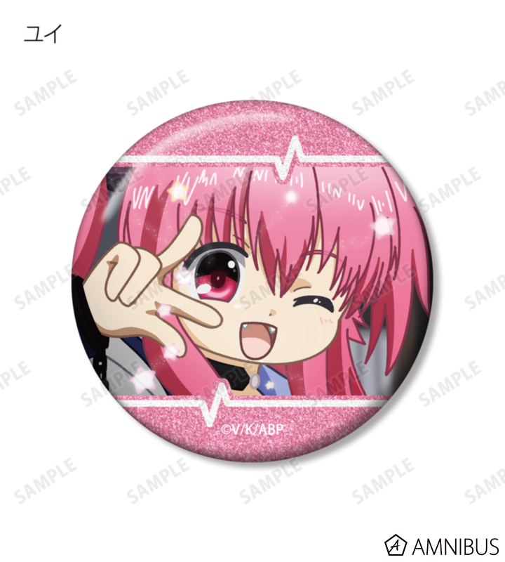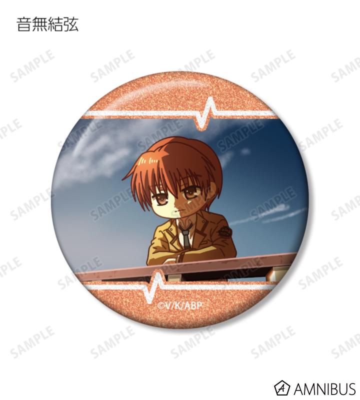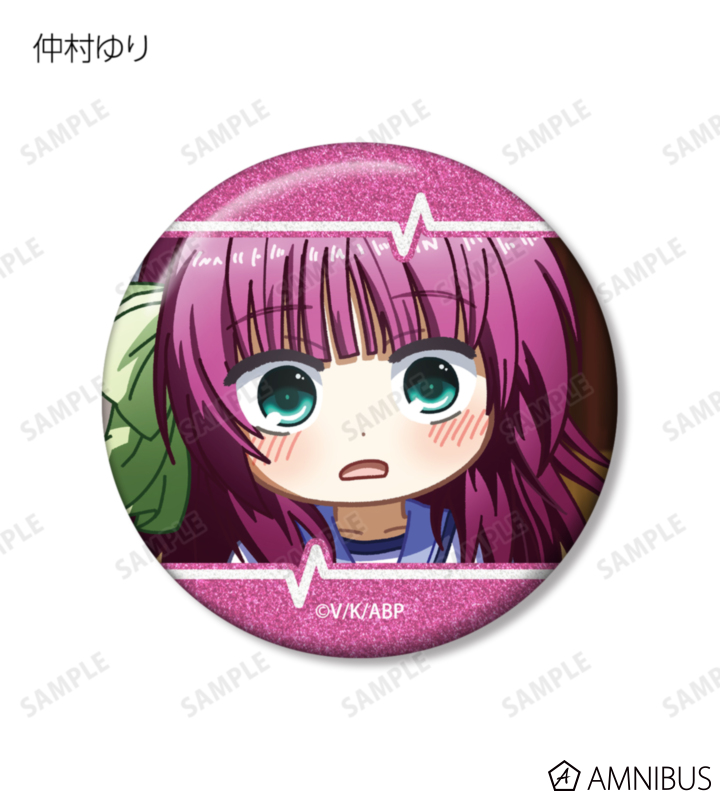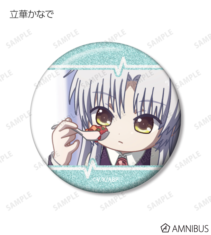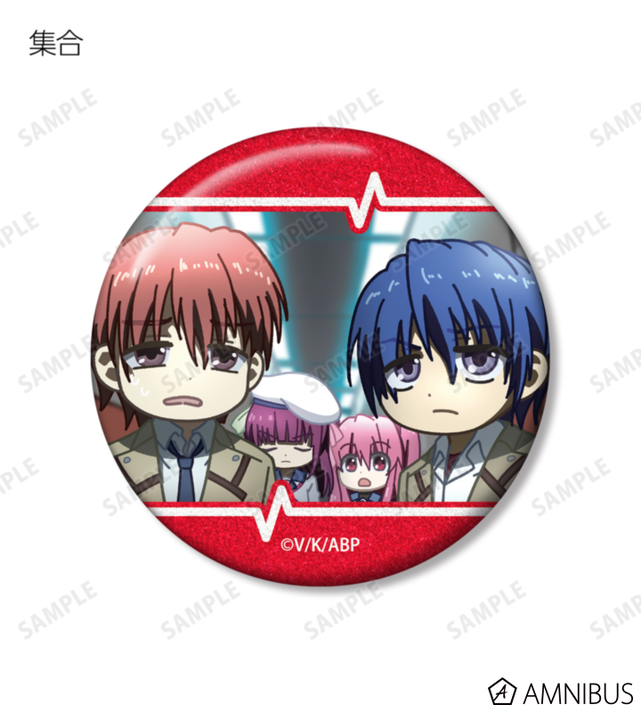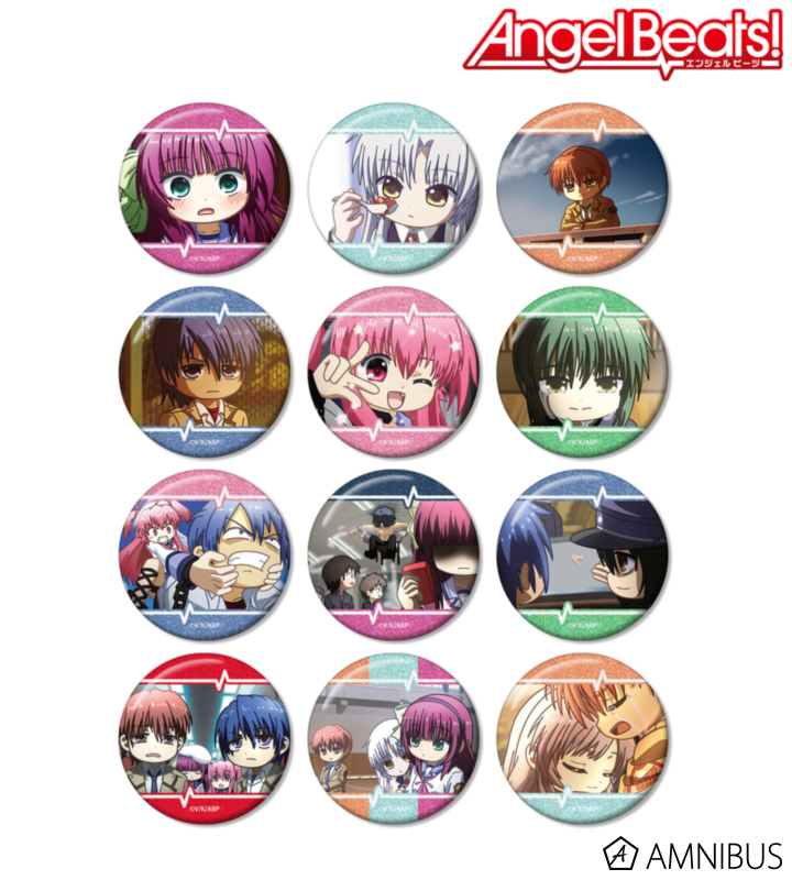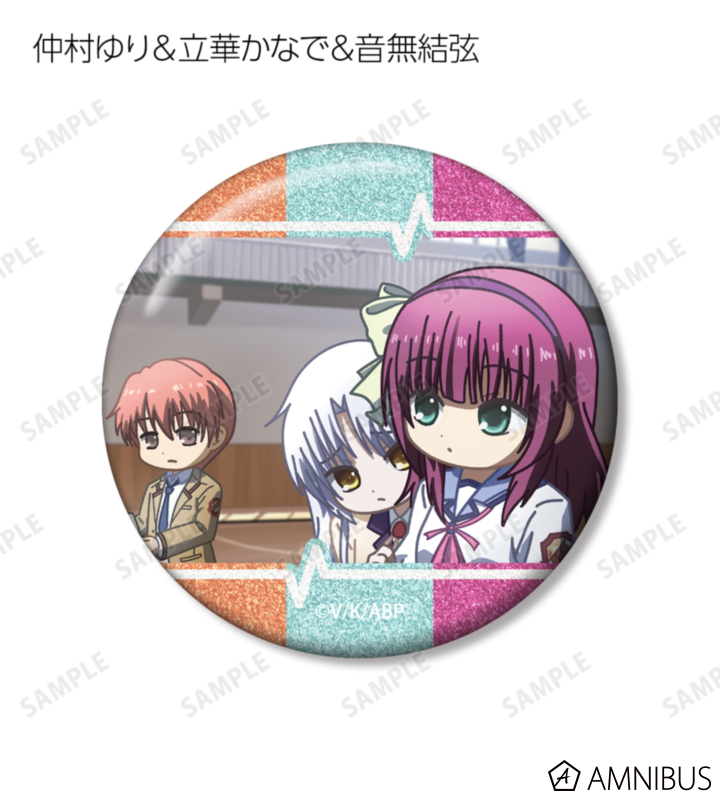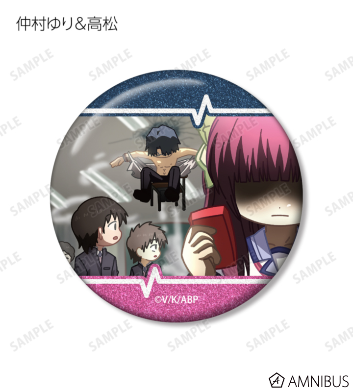 仲村ゆり、立華かなで、音無結弦、日向秀樹、ユイ、直井文人、高松の印象的なシーンをそのままデフォルメで再現し、グリッター加工を施した缶バッジに仕上げました。
