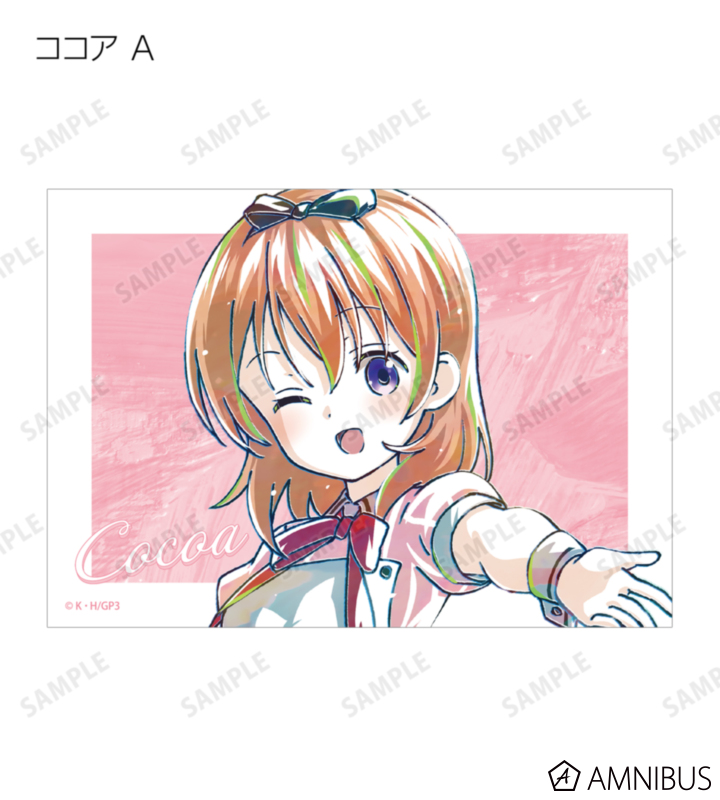 ココア、チノ、リゼ、千夜、シャロ、マヤ、メグのイラストを新たなタッチで魅力的に表現し、ブロマイドに仕上げました。
