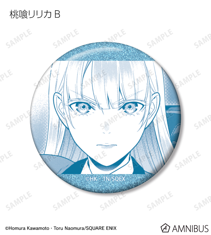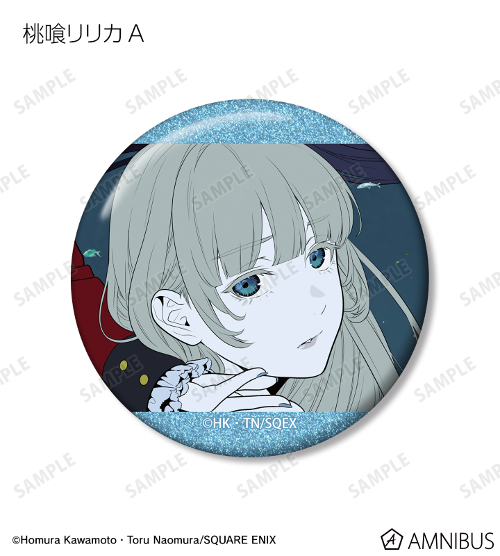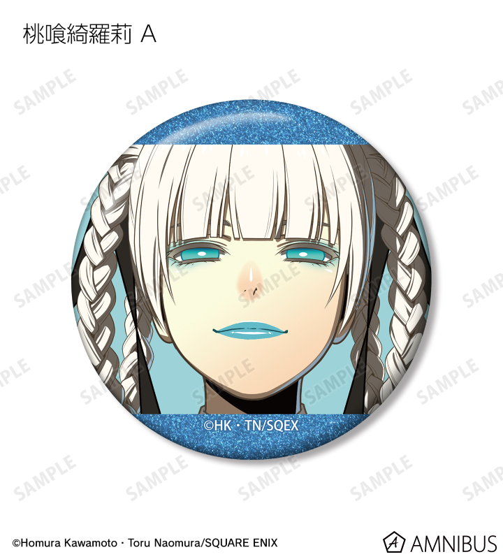 蛇喰夢子、桃喰綺羅莉、早乙女芽亜里、桃喰リリカのカラーイラスト、原作コマイラストをグリッター加工を施した缶バッジに仕上げました。