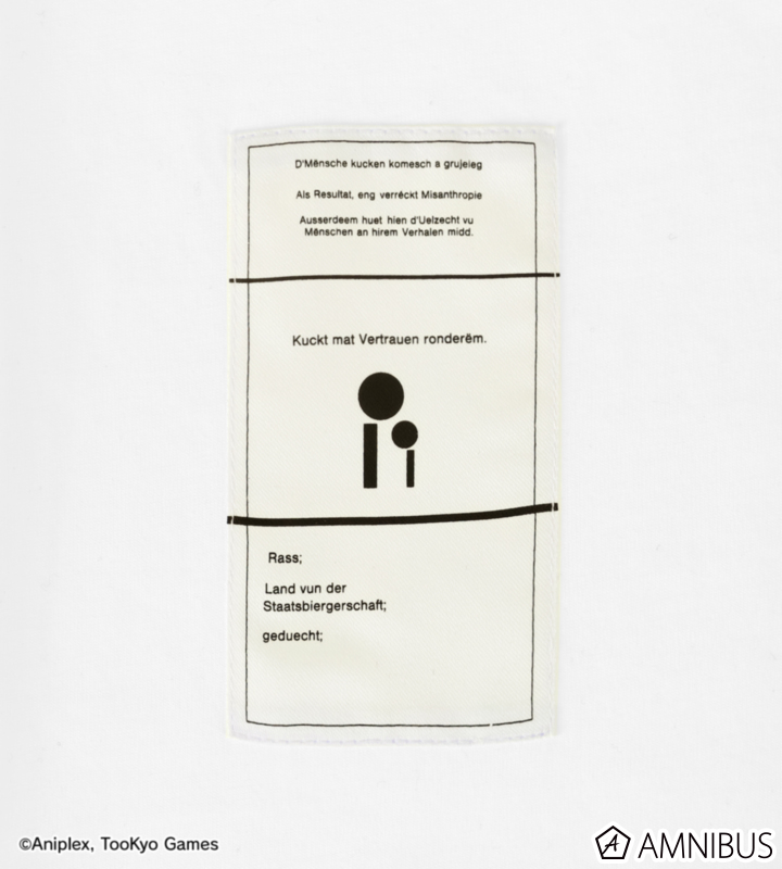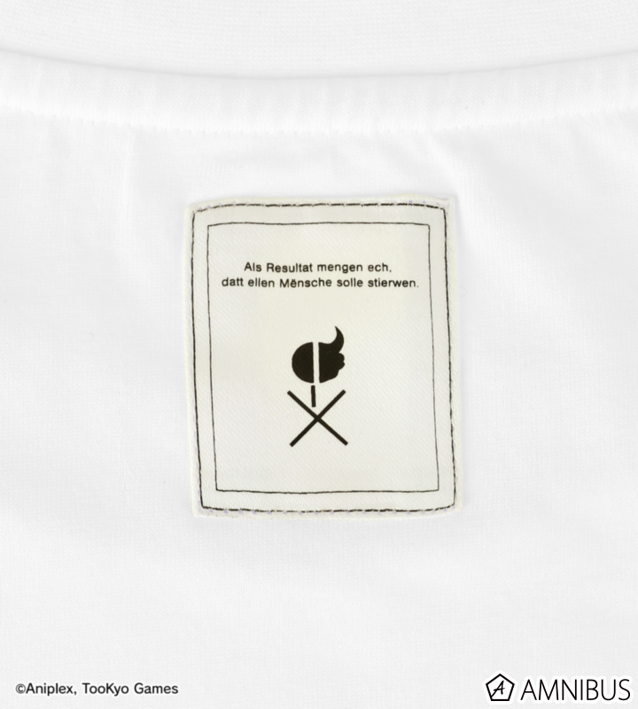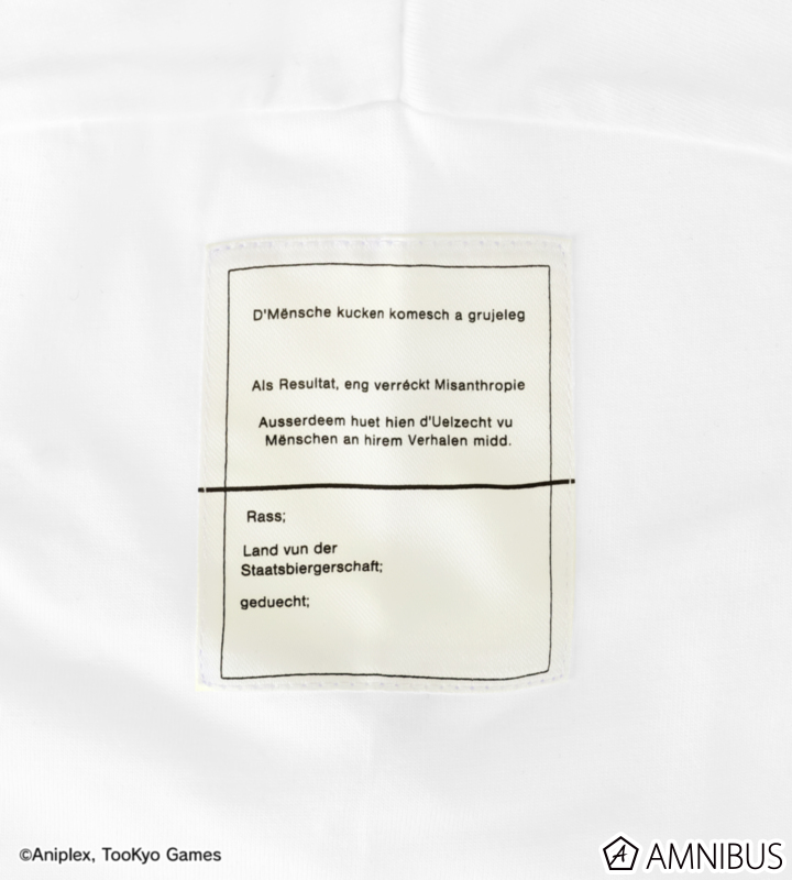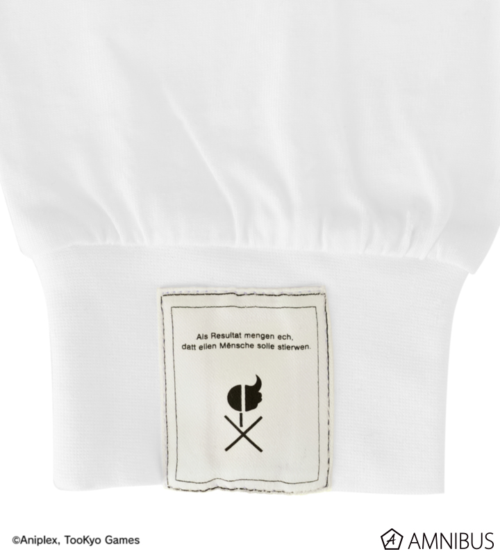 グラフィックとテキストでデザインされたタグを、作中と同じく、右肩、表面の裾元、背面の首元、左袖口の計4ヶ所に縫い付けています。