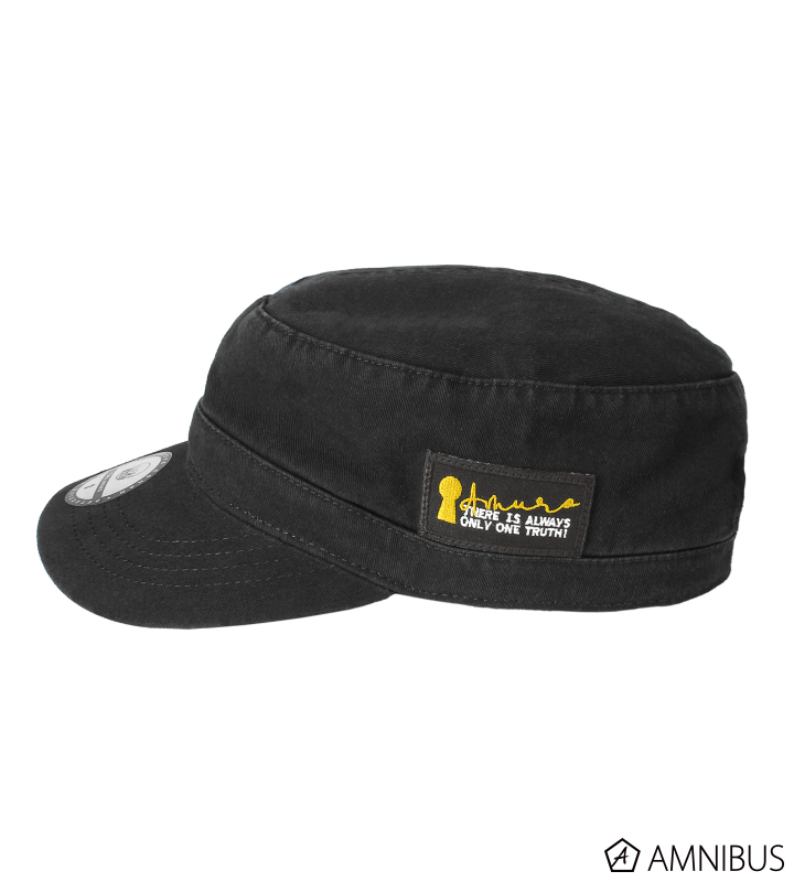 ツバの部分にはアイコンマークや作品タイトルなどを組み合わせたデザインのステッカーを貼り付けています。