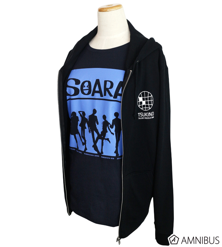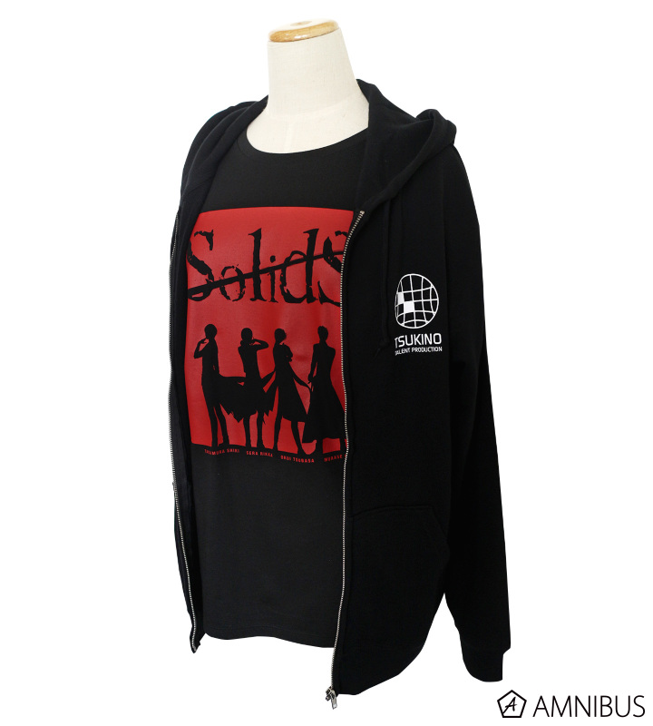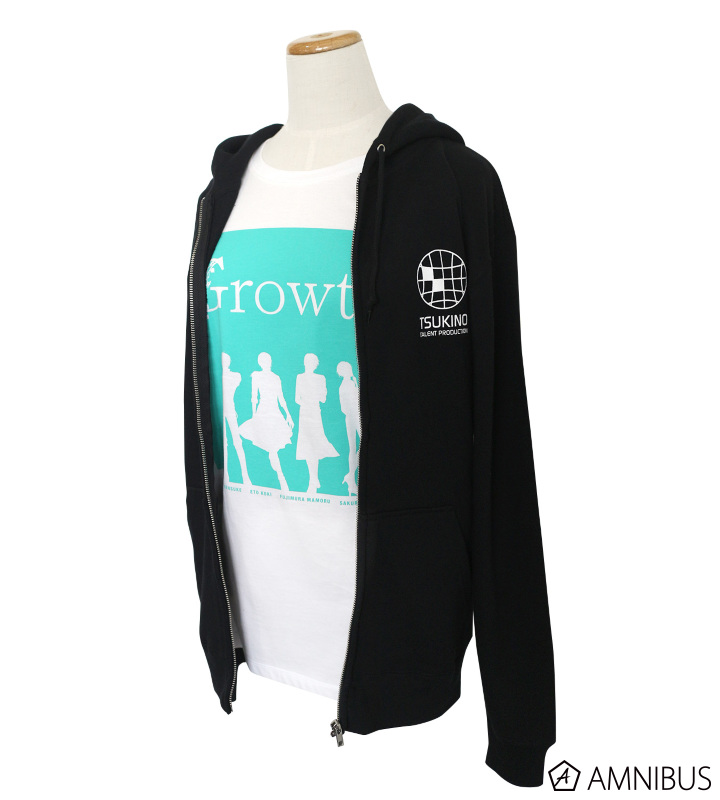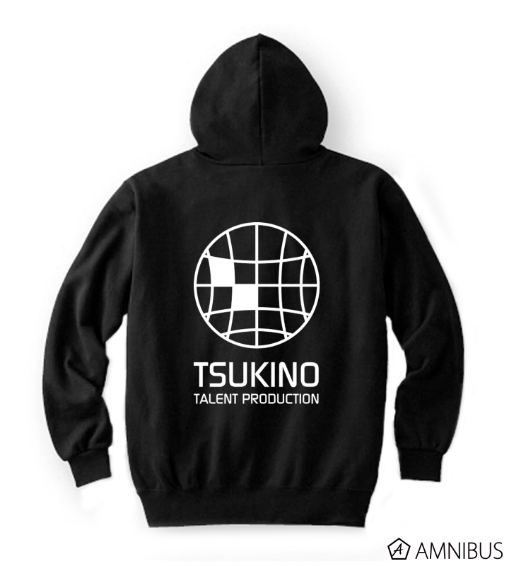 ブラックのパーカーの胸と背中にツキノ芸能プロダクションのロゴをプリントし、気分はあなたも事務所スタッフに。