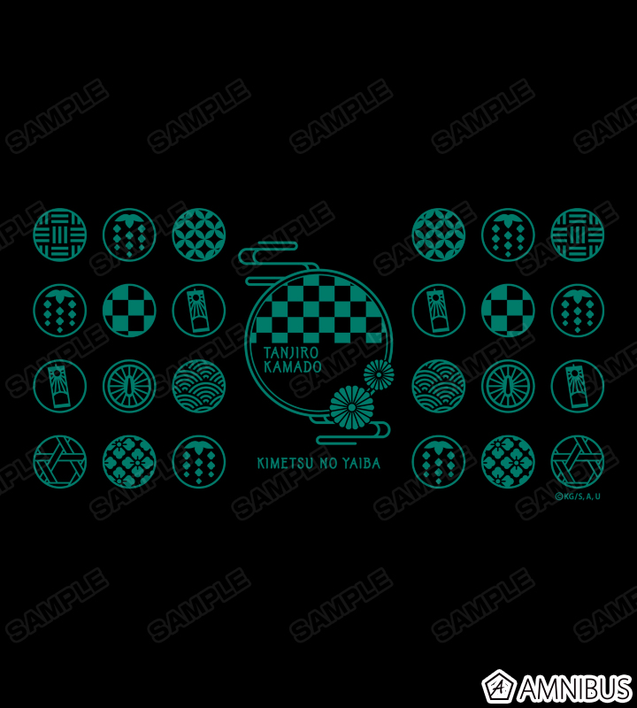 竈門炭治郎の羽織の柄、耳飾り、日輪刀の鍔、藤の花などを和風のモチーフと合わせてレイアウトしたデザインに仕上げています。