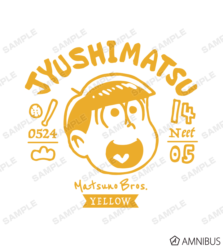 十四松や野球バット、ボール、14の数字、誕生日、松マークなどを合わせてレイアウトし、カレッジ風のデザインに仕上げました。