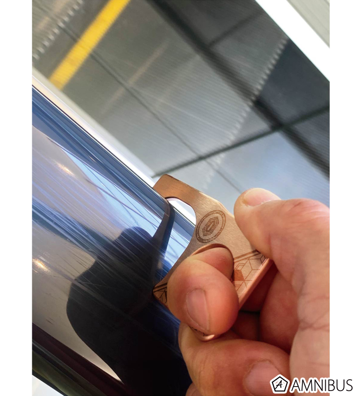 多くの電車、バスで採用されている直径32mmまでのパイプに掛けられるよう設計となっており、直接手で触る製品のため、安全性を確保した滑らかな曲面のヘアライン加工を施しています。