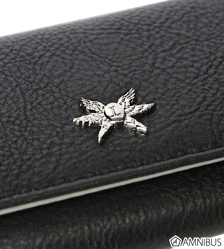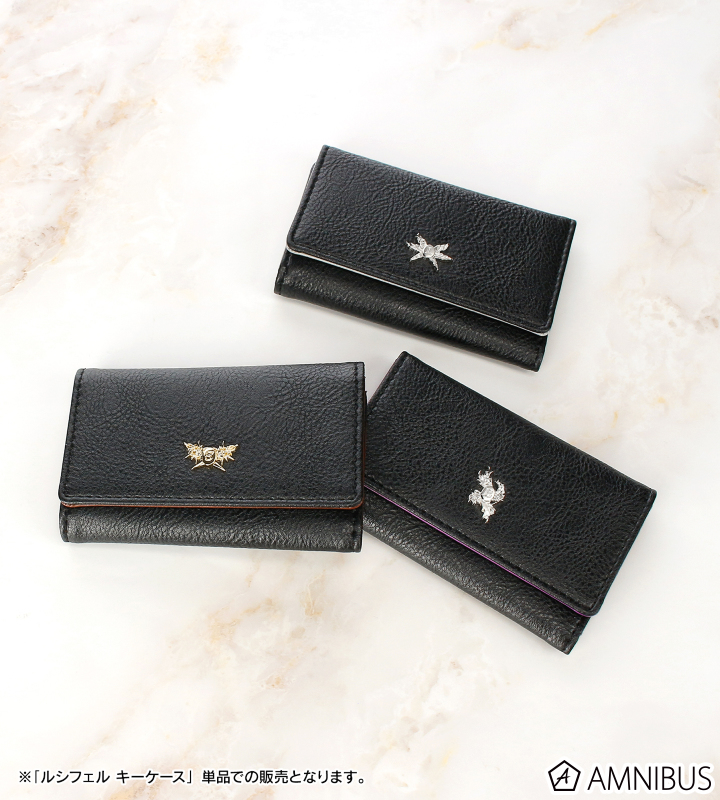 ルシフェルの羽根をモチーフにしたシルバーカラーのプレートをあしらい、内面はルシフェルのイニシャルをベースにした総柄デザインで、キャラクターからイメージしたカラーリングで仕上げています。