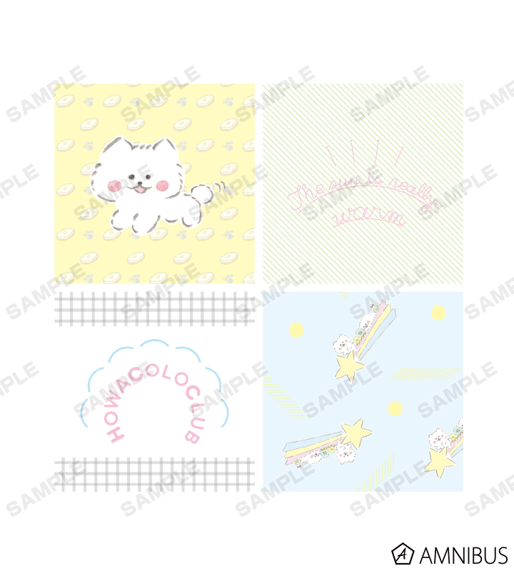 ほわころちゃん、むくころちゃん、ぼーちゃん、まりちゃん、ペンちゃんをレイアウトして、作品からイメージしたデザインに仕上げました。