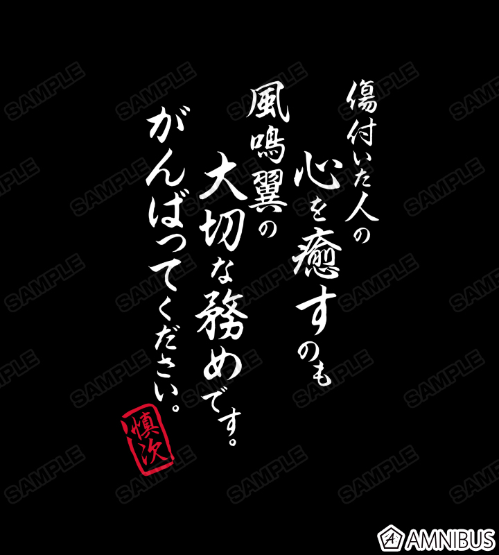 緒川 慎次のセリフ「傷付いた人の心を癒すのも風鳴翼の大切な務めです。がんばってください。」を筆文字で書いたようなインパクトのあるデザインに仕上げました。