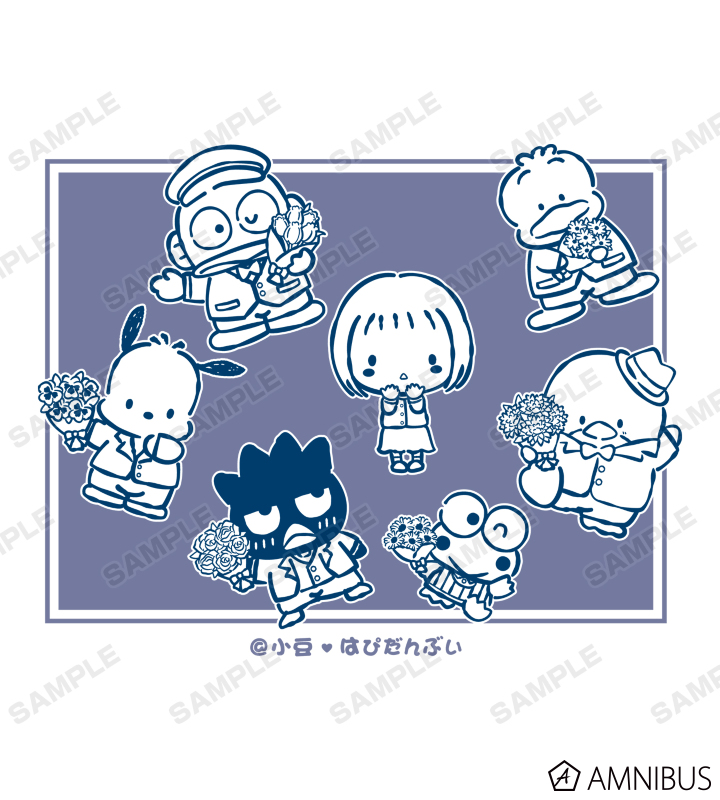 @小豆、タキシードサム、ポチャッコ、ハンギョドン、けろけろけろっぴ、あひるのペックル、バッドばつ丸を合わせてレイアウトしたデザインに仕上げました。
