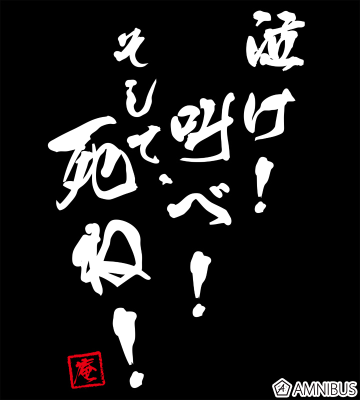 八神庵の台詞「泣け!叫べ!そして、死ね!」を墨文字風にデザインしました。