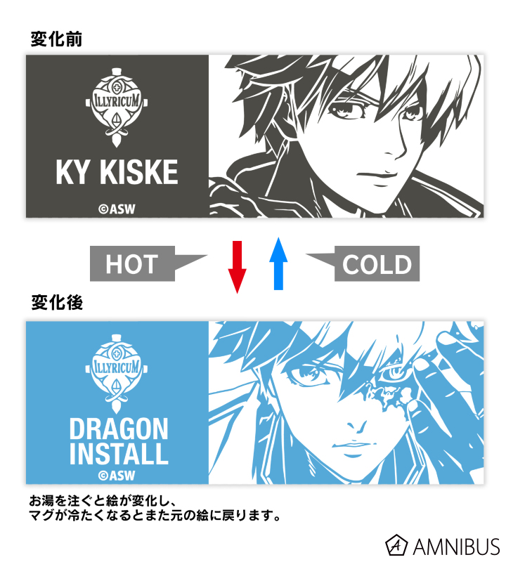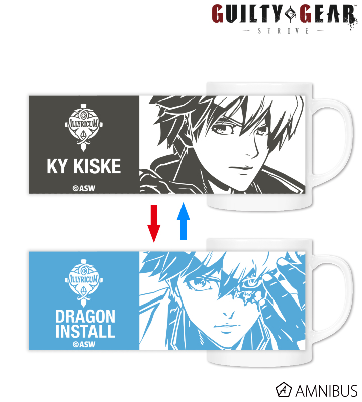 温度に反応する特殊なインクを使用しており、マグカップに温かい飲み物を入れるとカイ=キスクがドラゴンインストールによってギア化した姿に絵柄が変化します。