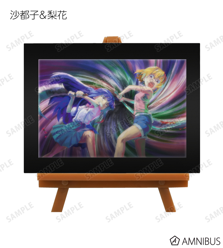前原圭一、竜宮レナ、園崎魅音、北条沙都子、古手梨花、園崎詩音、羽入、エウアの場面写にアクリルを載せ、立体感のある加工を施したアートフレームのようなアイテムです。