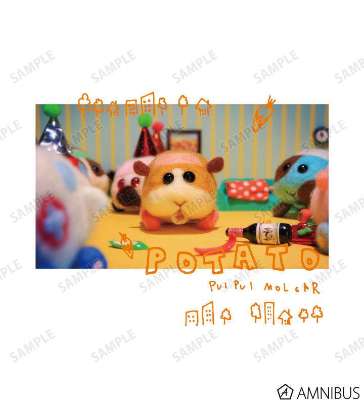 ポテトの作中のシーンをメインに、手描き風のイラストや名前と合わせてレイアウトしました。