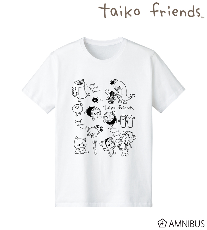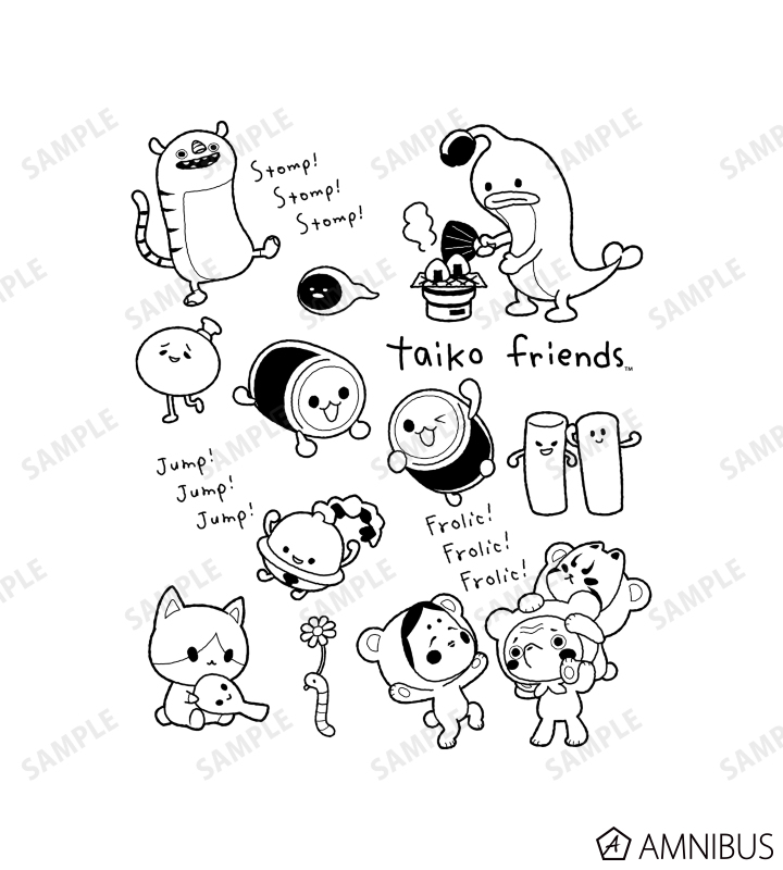 どんちゃん、かっちゃん、バチお先生、お面小僧、ちょうちんうなぎ、和田ミミズ、すずどん、水マリ子、たましい、ネコと杓子、とらまいと「taiko friends.」の文字を組み合わせ、フロントにレイアウトしたデザインに仕上げました。