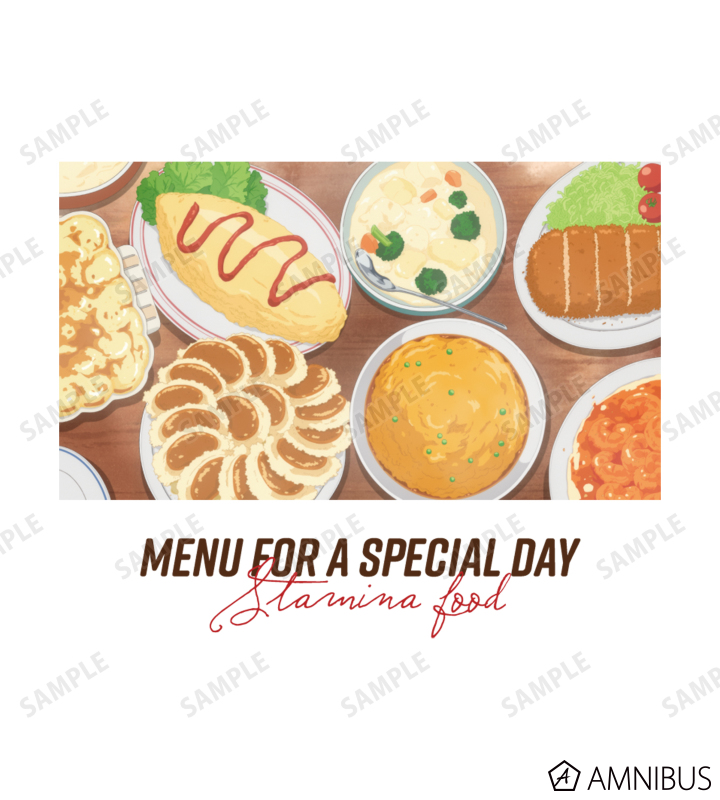 アニメ2話でキヨがすみれのために精のつくスタミナ料理を作った時の場面写に、タイトルの「特別な日のためのごはん」とテーマとなる「スタミナフード」の英訳を合わせてデザインしました。