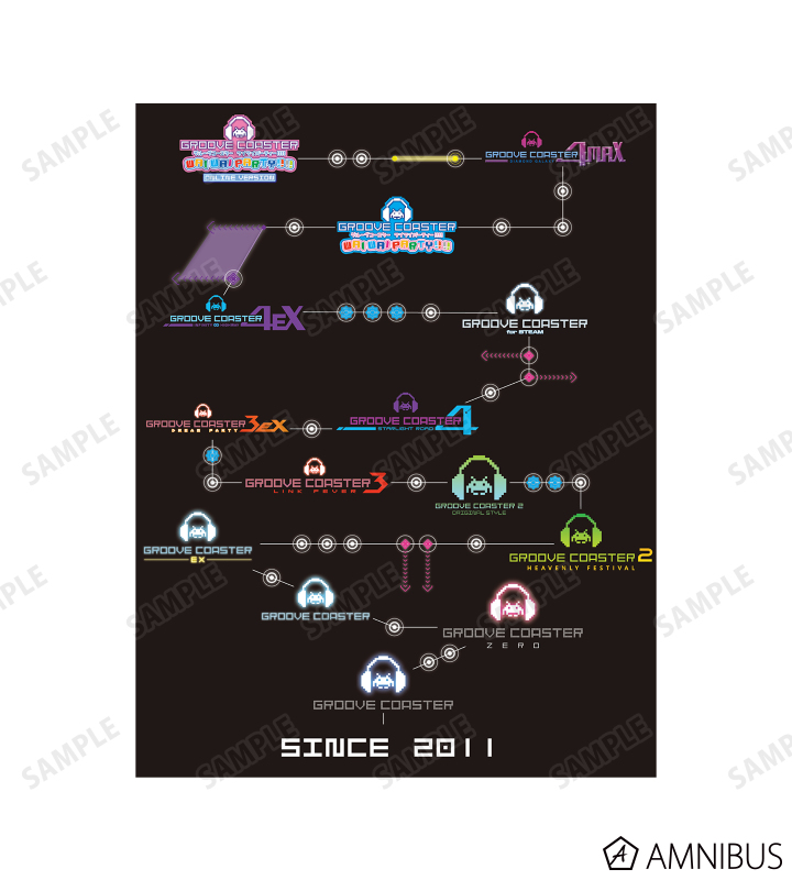 歴代の「グルーヴコースター」シリーズのロゴを、ゲームの画面に見立ててレイアウトしたデザインに仕上げました。