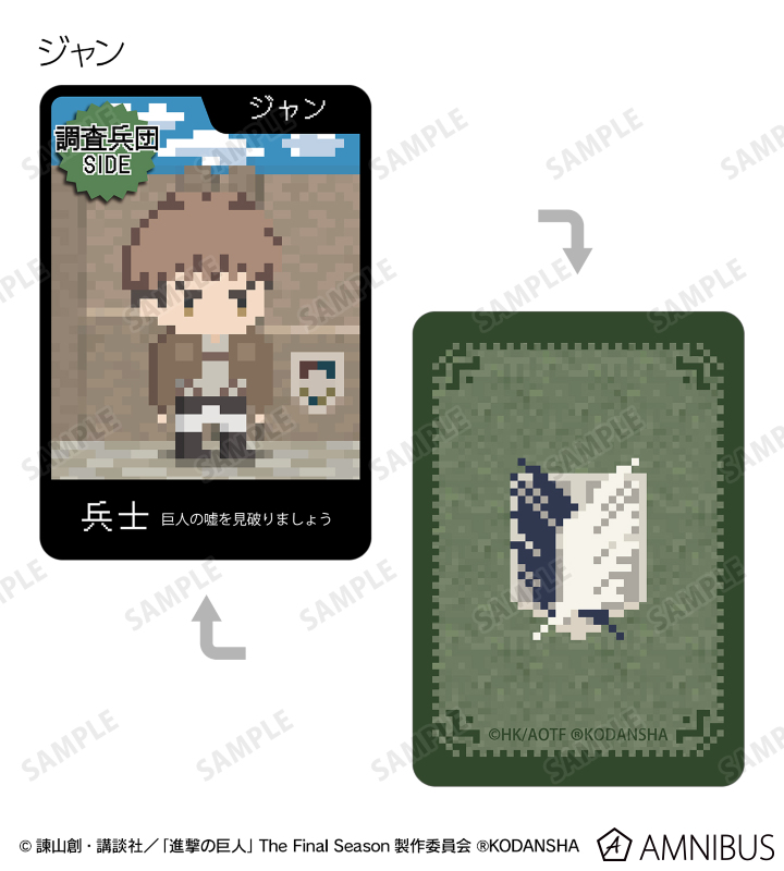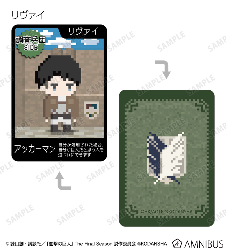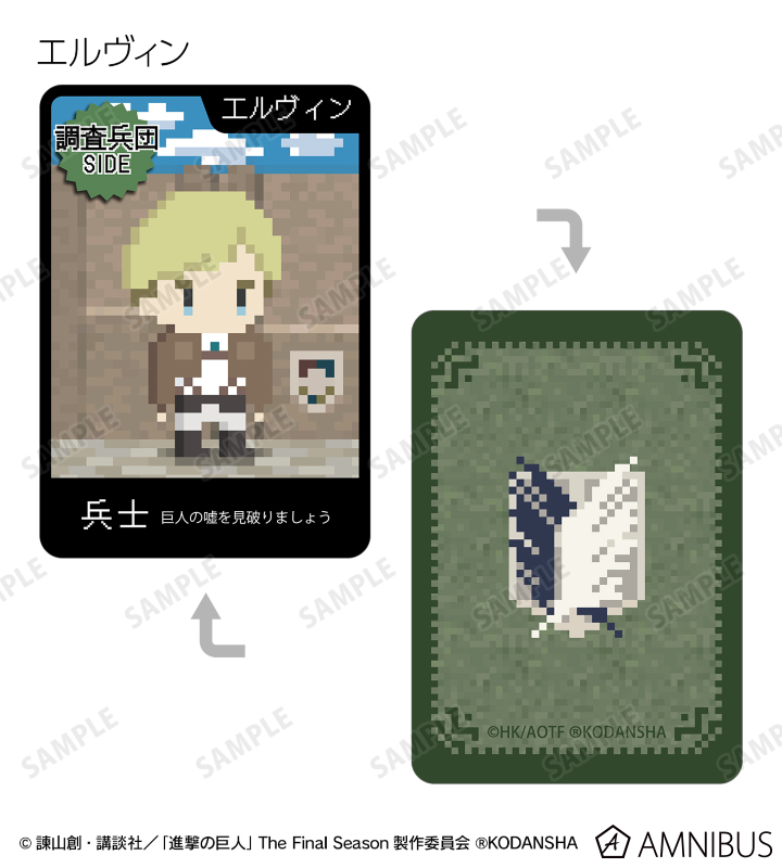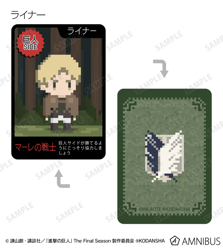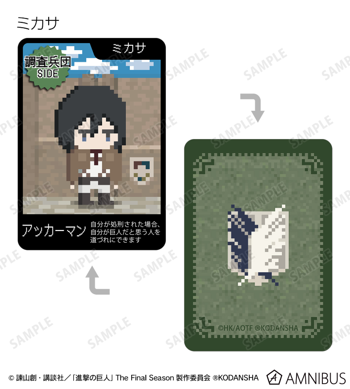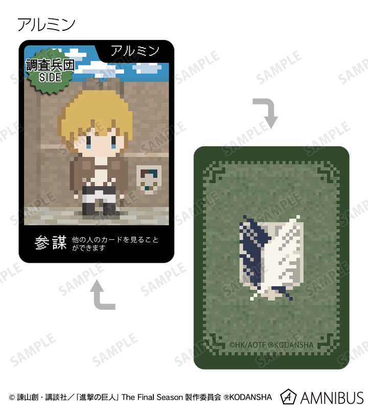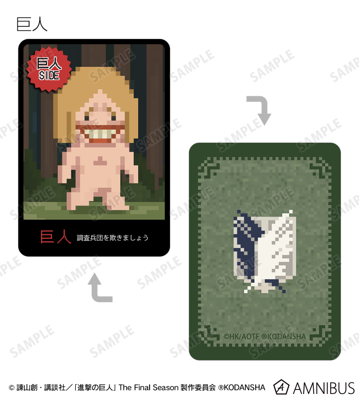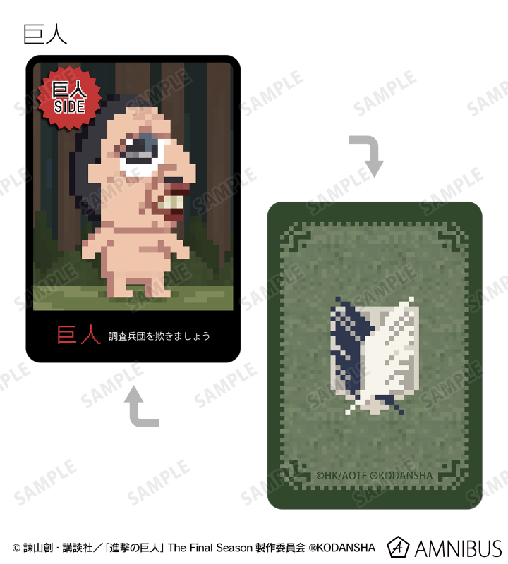 エレン 、ミカサ 、アルミン 、ジャン 、サシャ 、エルヴィン 、リヴァイ 、ライナー、巨人をドット絵風に描き起こしたイラストを、進撃の巨人の世界観に沿った役職名と合わせてワンナイト人狼のカードに落とし込みました。