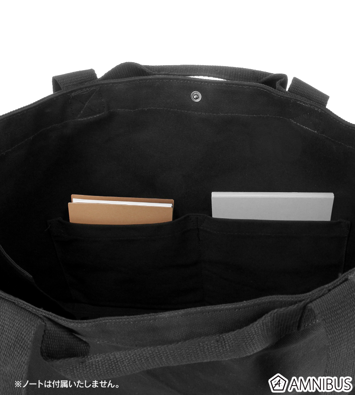 内ポケットが2つと側面にファスナー付きポケットを備えており、厚みのある生地で大容量の収納に適しています。