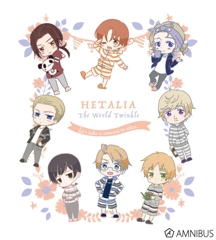 ルームウェアを着たイタリア・ドイツ・日本・アメリカ・イギリス・フランス・ロシア・中国の描き起こしちびキャライラストを使用してデザインしました。