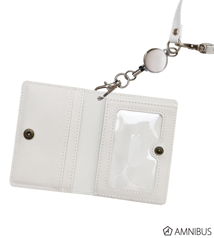 コンパクトに持ち運びいただける2つ折りタイプで、カード収納のできるポケットが4つと便利なリールストラップ付きです。