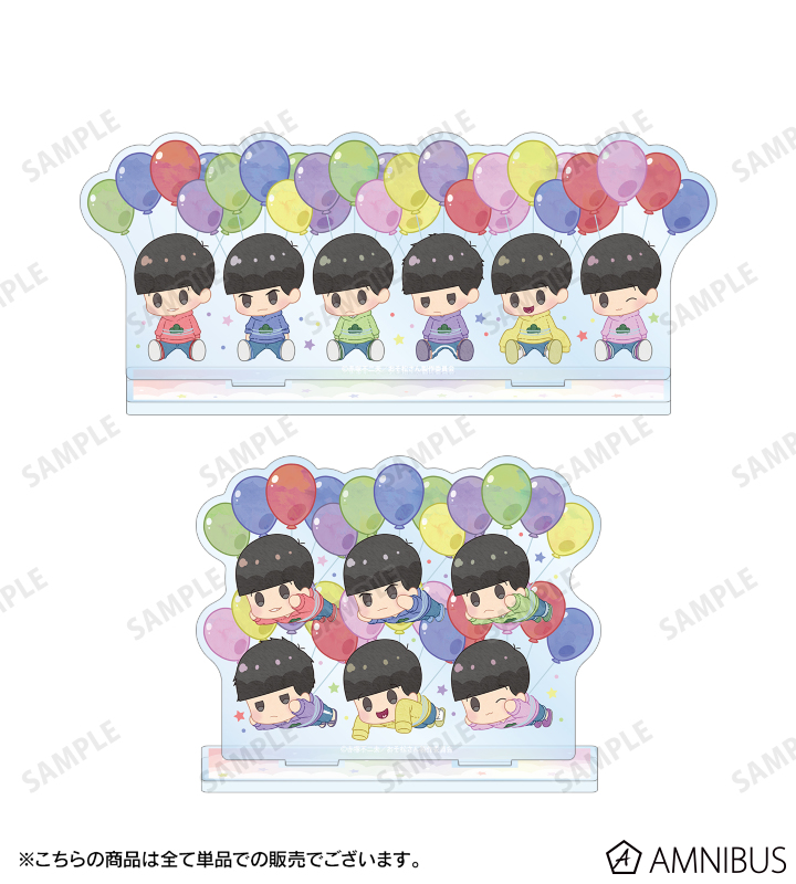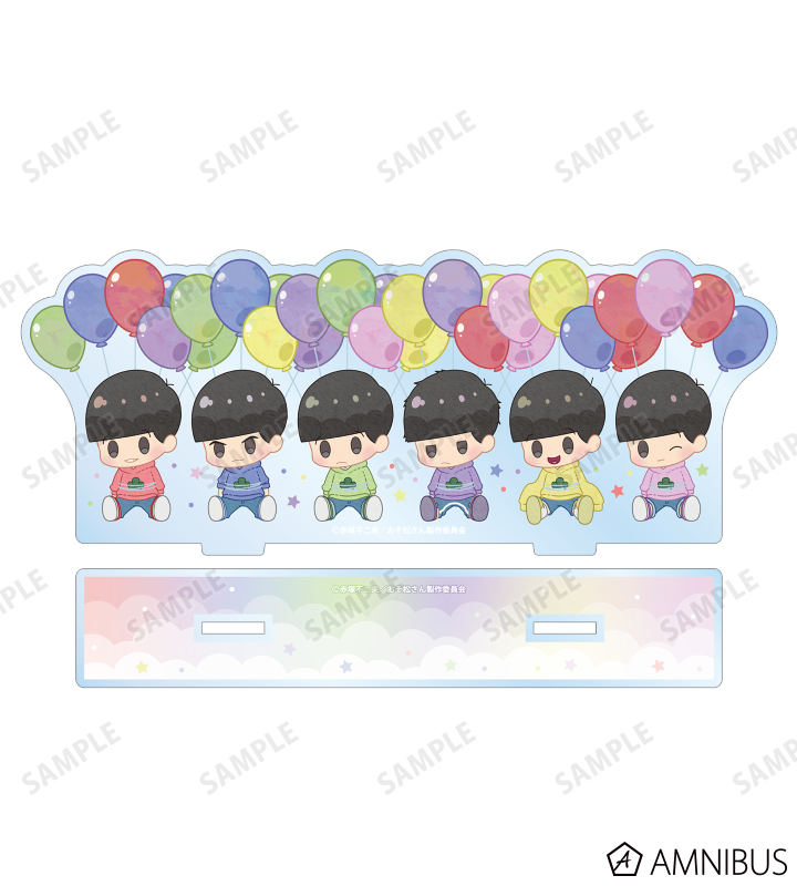 おそ松、カラ松、チョロ松、一松、十四松、トド松をお空に風船でぷかぷかと浮いたぬいぐるみをイメージして描き起こし、BIGなアクリルスタンドに仕上げました。