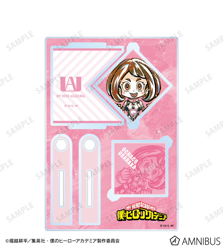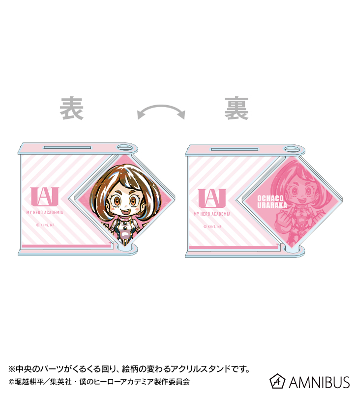 麗日お茶子を新たなタッチで魅力的に表現し、キャラクター部分がくるくる回るアクリルスタンドに仕上げました。