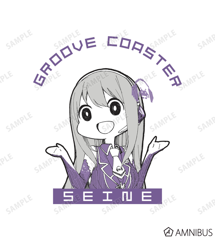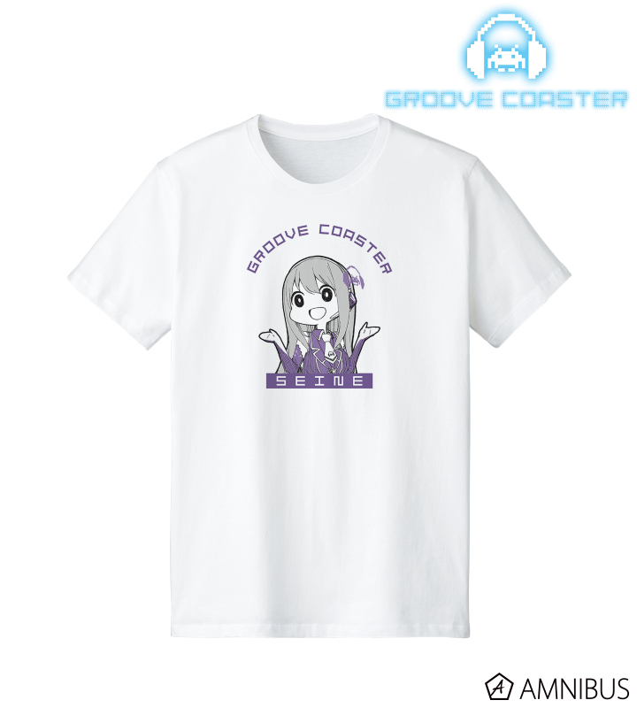 セイネと作品タイトル、キャラクター名を組み合わせ、カレッジ風デザインのTシャツに仕上げました。