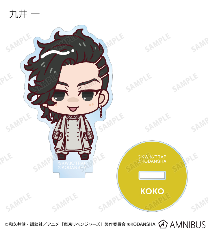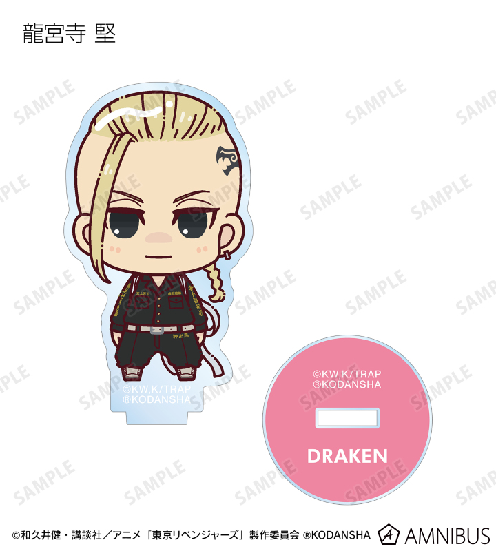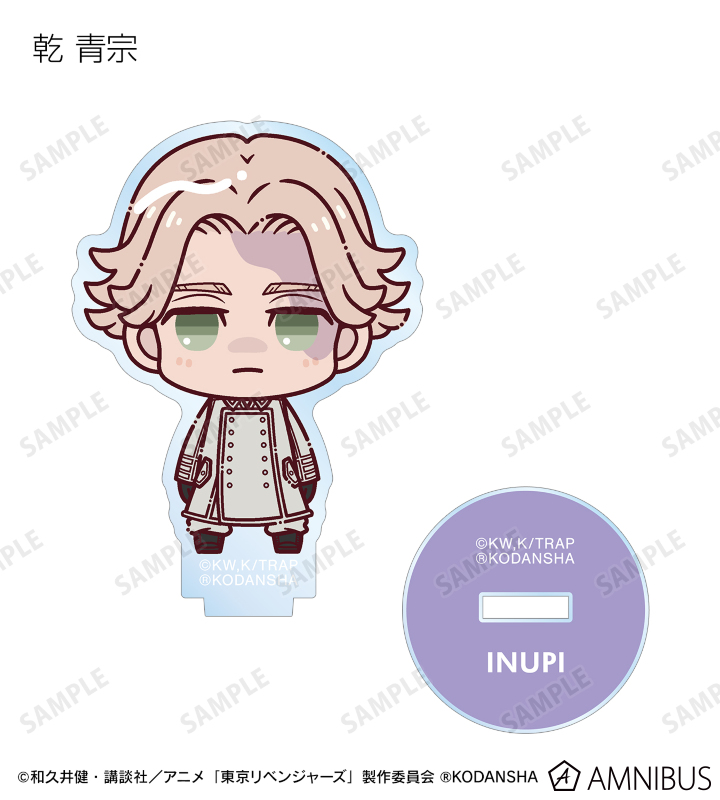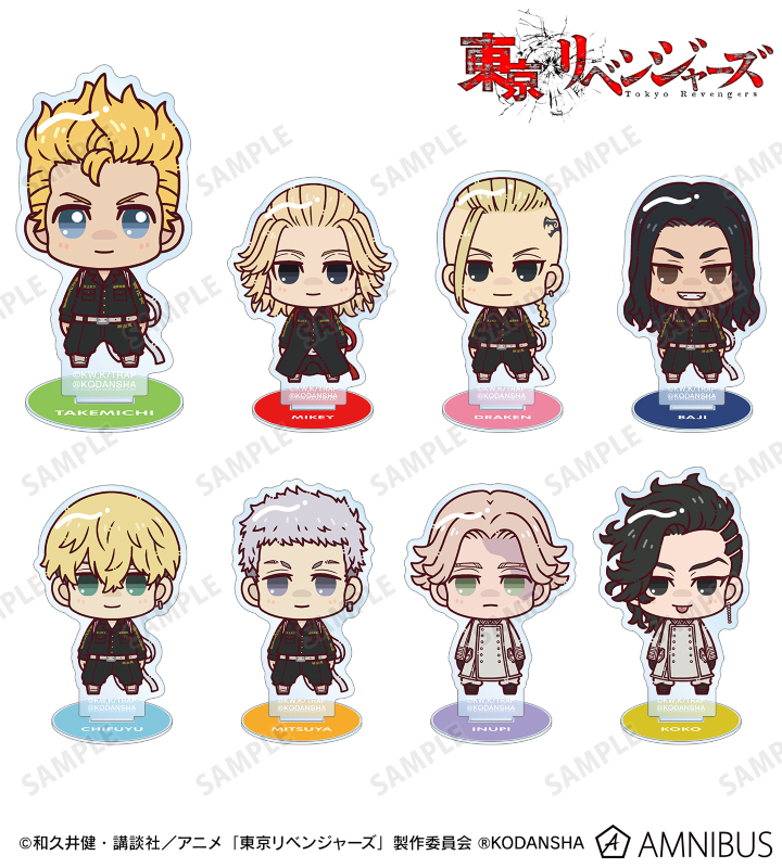 花垣 武道、佐野 万次郎、龍宮寺 堅、場地 圭介、松野 千冬、三ツ谷 隆、乾 青宗、九井 一がちょこんと立っているちびキャラを新たに描き起こし、アクリルスタンドに仕上げました。