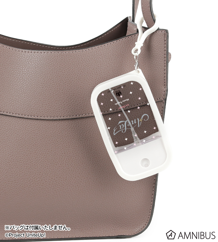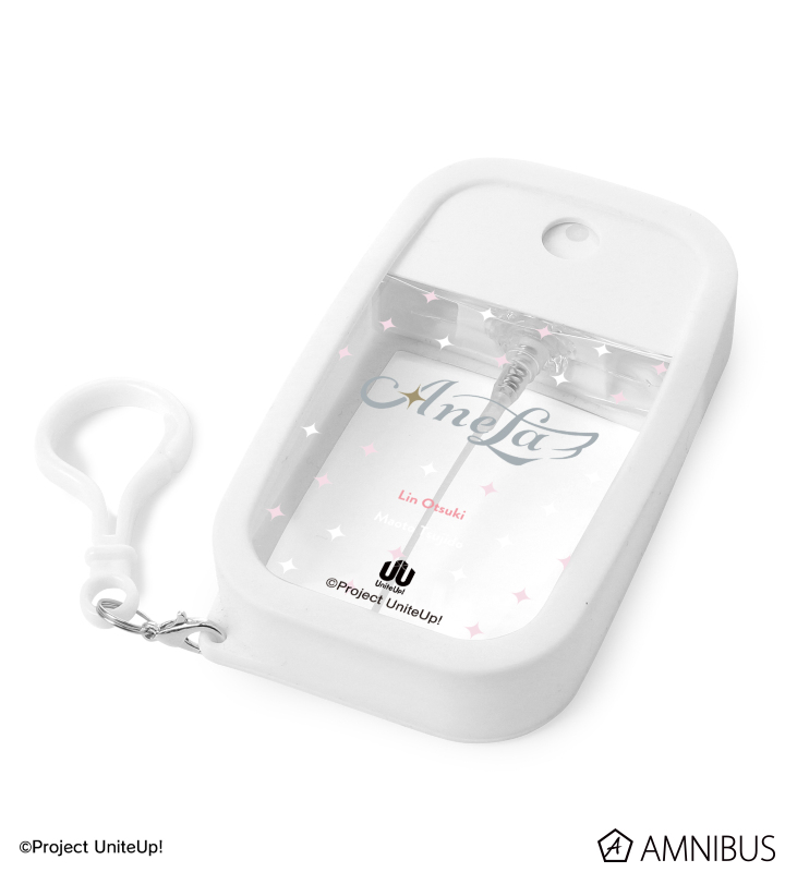 Anelaのユニットロゴと、大月 凛、辻堂真音の名前の英字表記をシリコンカバー付きスプレーボトルに仕上げました。