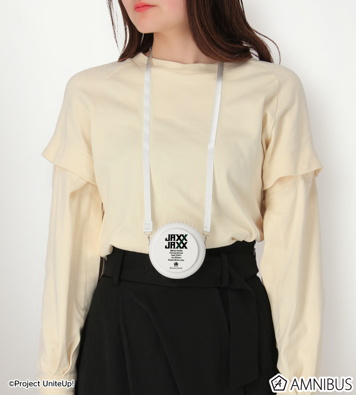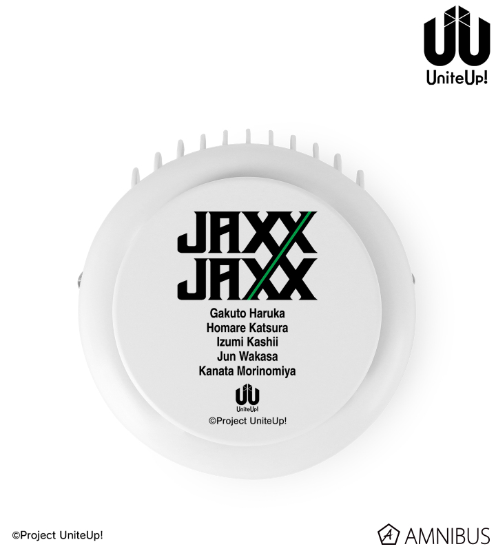 JAXX/JAXXのユニットロゴと、春賀楽翔、桂 ほまれ、香椎一澄、若桜 潤、森ノ宮奏太の名前の英字表記をハンディファンに仕上げました。