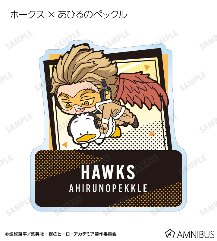 オールマイト×ハローキティ、相澤消太×チョコキャット、エンデヴァー×ポムポムプリン、ホークス×あひるのペックル、死柄木弔×ぐでたま、荼毘×ハンギョドン、トガヒミコ×クロミ、トゥワイス×おさるのもんきちのビジュアルをアクリルネームプレートに仕上げました。