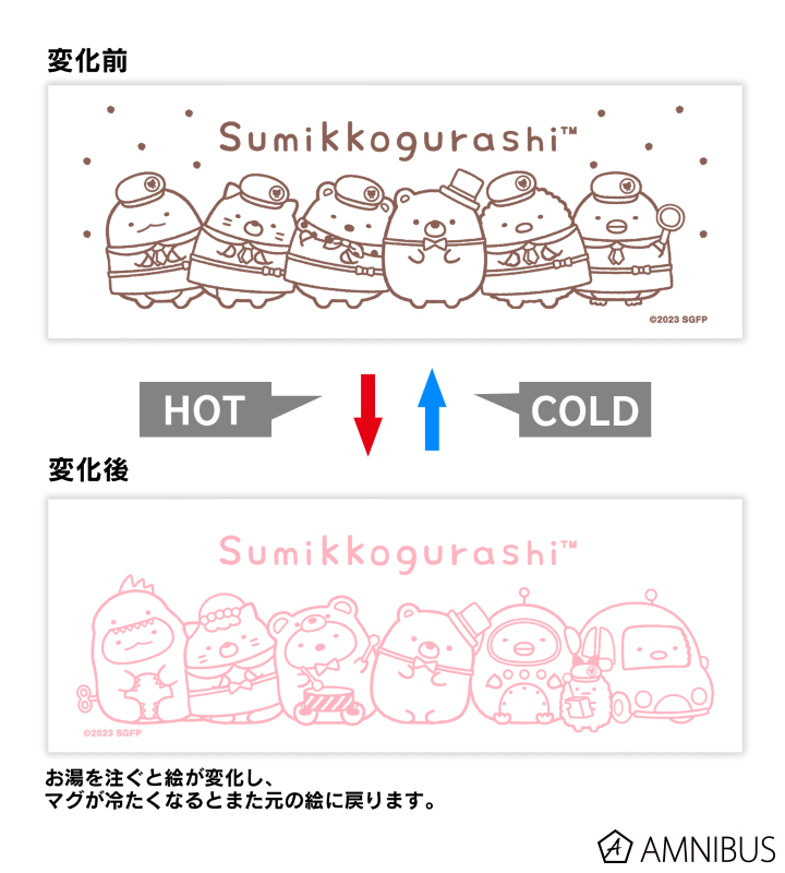 温度に反応する特殊なインクを使用しており、マグカップに温かい飲み物を入れると、すみっコたちの衣装がおもちゃ衣装へ変化します。