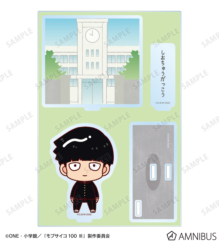 影山茂夫がちょこんと塩中学校の前に立っているちびキャラを新たに描き起こし、パーツ付きのBIGなアクリルスタンドに仕上げました。