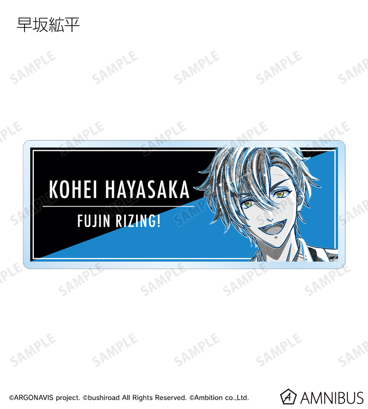 旭 那由多、里塚賢汰、美園礼音、曙 涼、界川深幸、神ノ島風太、椿 大和、早坂絋平、若草あおい、五島 岬、宇治川紫夕、二条 遥、二条 奏、鞍馬唯臣、烏丸玲司のイラスト、メンバーの名前、バンド名を新たなタッチで魅力的に表現し、アクリルネームプレートに仕上げました。