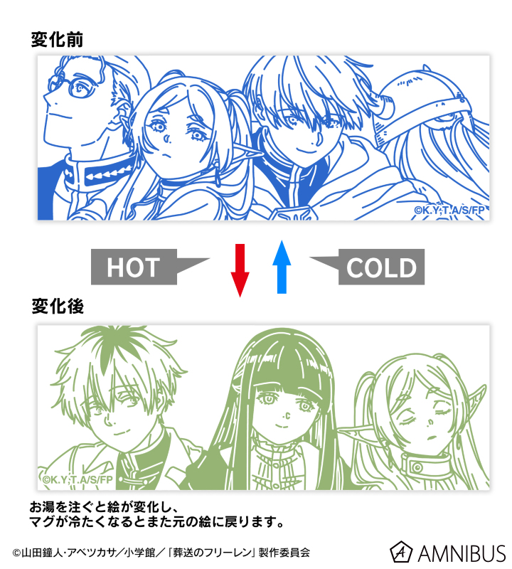 温度に反応する特殊なインクを使用しており、マグカップに温かい飲み物を入れると、勇者一行からフリーレン、フェルン、シュタルクに絵柄が変化します。