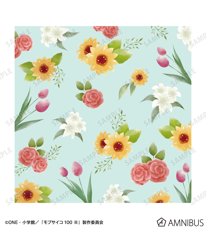 影山茂夫、霊幻新隆、エクボ、影山律、花沢輝気、芹沢克也と花をボタニカルデザインに落とし込み、繊細なタッチで新たに描き起こしました。