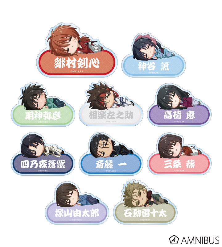 緋村剣心、神谷 薫、明神弥彦、相楽左之助、高荷 恵、四乃森蒼紫、斎藤 一、三条 燕、塚山由太郎、石動雷十太がころんと寝ているちびキャラを新たに描き起こし、アクリルネームプレートに仕上げました。