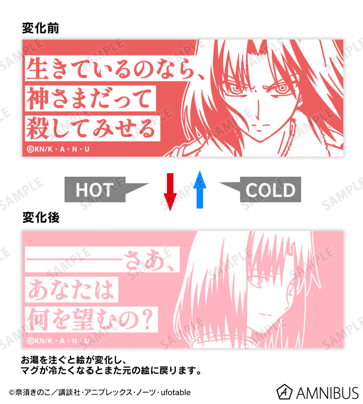 温度に反応する特殊なインクを使用しており、マグカップに温かい飲み物を入れると、両儀式の台詞と絵柄が変化します。
