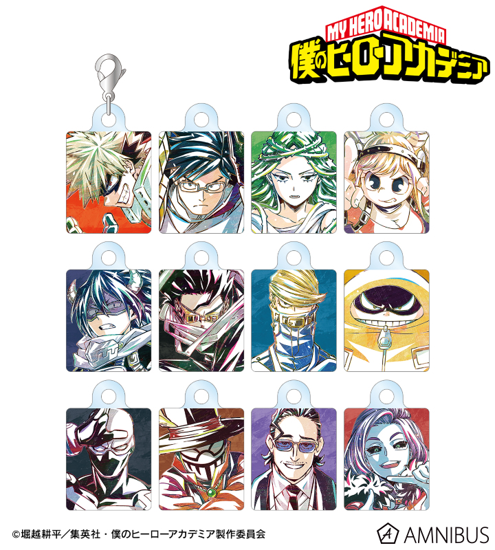 爆豪勝己、飯田天哉、塩崎茨、角取ポニー、天喰環、イレイザーヘッド、ベストジーニスト、ファットガム、トゥワイス、Mr.コンプレス、トランペット、キュリオスのビジュアルを新たなタッチで魅力的に表現し、ダイカットのアクリルチャームに仕上げました。