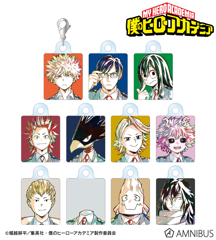 爆豪勝己、飯田天哉、蛙吹梅雨、切島鋭児郎、常闇踏陰、青山優雅、芦戸三奈、尾白猿夫、葉隠透、口田甲司、イレイザーヘッドのビジュアルを新たなタッチで魅力的に表現し、ダイカットのアクリルチャームに仕上げました。