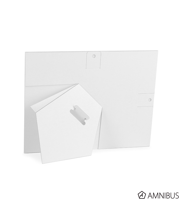 丈夫なマット紙で挟み込み、裏面にスタンドと壁掛け用の穴を搭載しました。