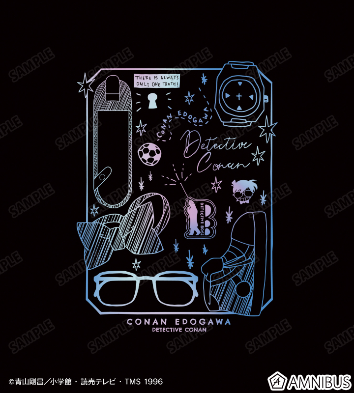 江戸川コナンにまつわる描き起こしモチーフ、キャラクター名、作品名、作中台詞の英字をパーカーに仕上げました。