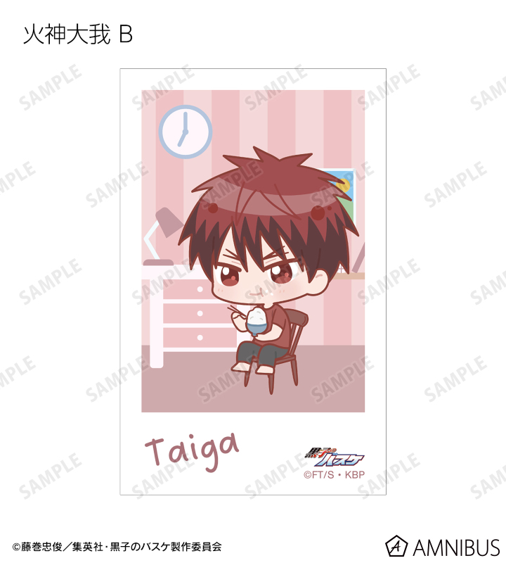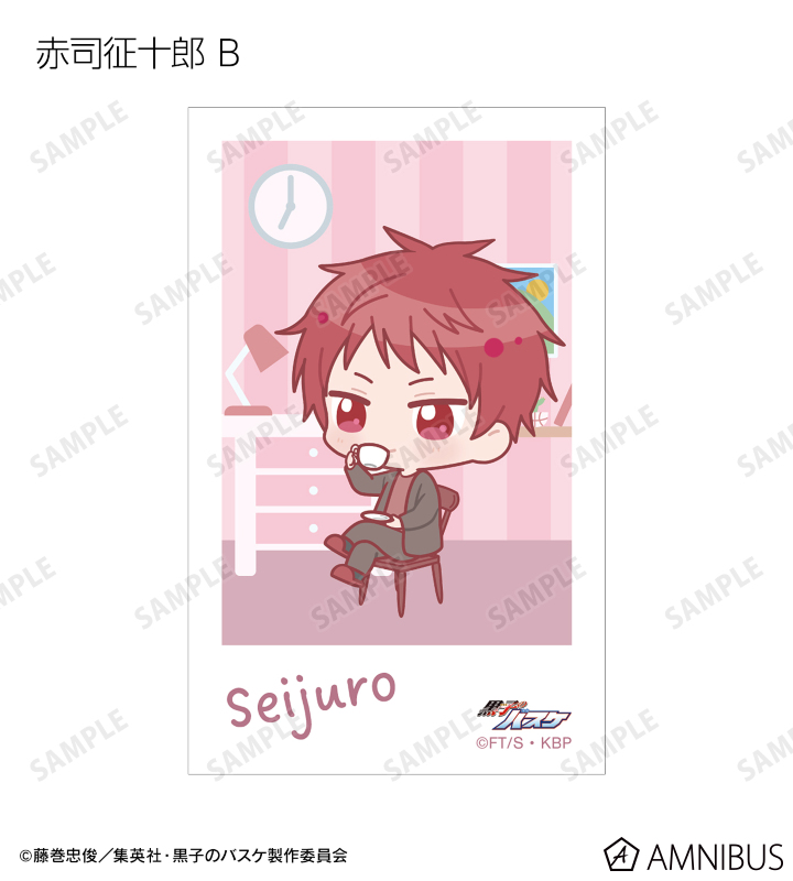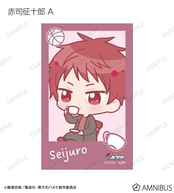 黒子テツヤ、火神大我、黄瀬涼太、緑間真太郎、青峰大輝、紫原 敦、赤司征十郎の描き起こしちびキャライラストをメインにインスタントフィルム風のイラストカードに仕上げました。