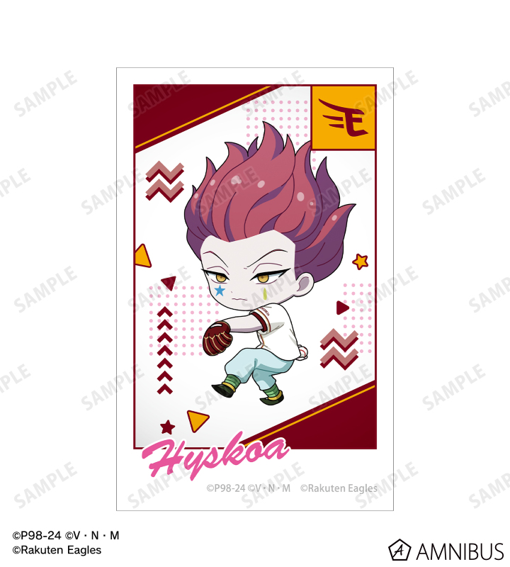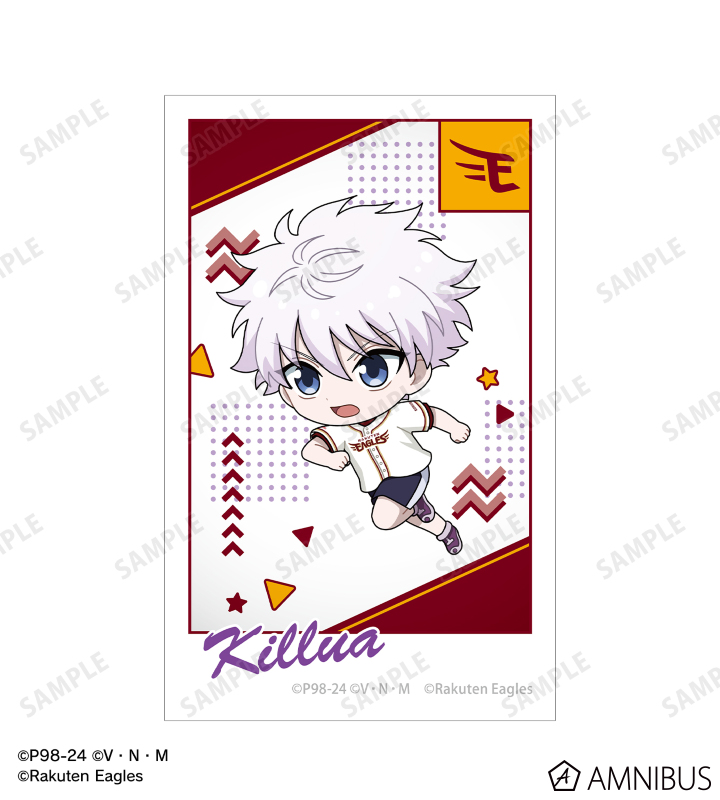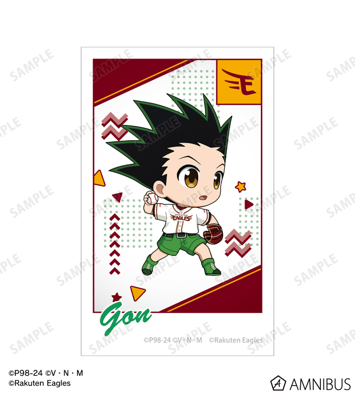 ゴン、キルア、レオリオ、クラピカ、ヒソカの描き起こしちびキャライラストと球団のロゴを、チームカラーに合わせたインスタントフィルム風のイラストカードに仕上げました。